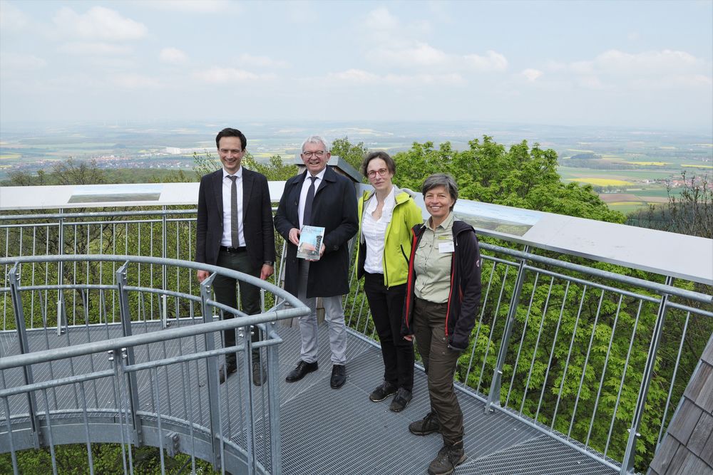 So hob Landrat Töpper in seinem Grußwort die gute Zusammenarbeit zwischen Landkreis und Naturpark hervor und dankte dem Naturpark-Vorsitzenden Landrat Kalb für sein Kommen und die Unterstützung des Projektes. Gemeinsam mit Naturpark-Geschäftsführerin Sandra Baritsch stiegen sie die 107 Stufen hinauf zur Aussichtsplattform und überzeugten sich von der ansprechenden Architektur und dem beindruckenden Panorama, das der Turm bietet. „Es ist schön, dass der Steigerwald über mehrere Landkreisgrenzen hinweg einer so großen Region Identität verleiht und Menschen zusammenbringt. Der Zabelsteinturm ist ein Symbol dieser Verbundenheit und ich komme immer wieder gerne hierher, es ist ein ganz besonderer Ort“, sagte Landrat Florian Töpper und dankte auch dem Steigerwaldklub Gerolzhofen für die Einladung zum Bergfest. „Sie leisten hier tolle Arbeit“, lobte er.