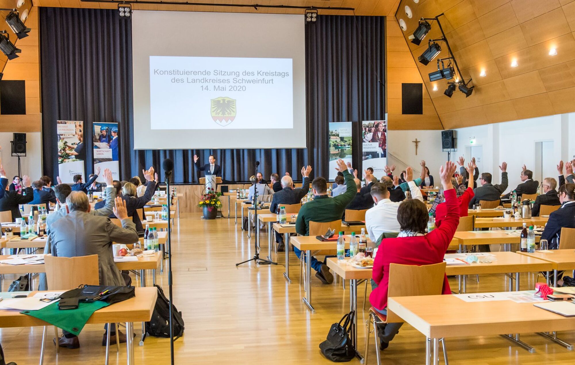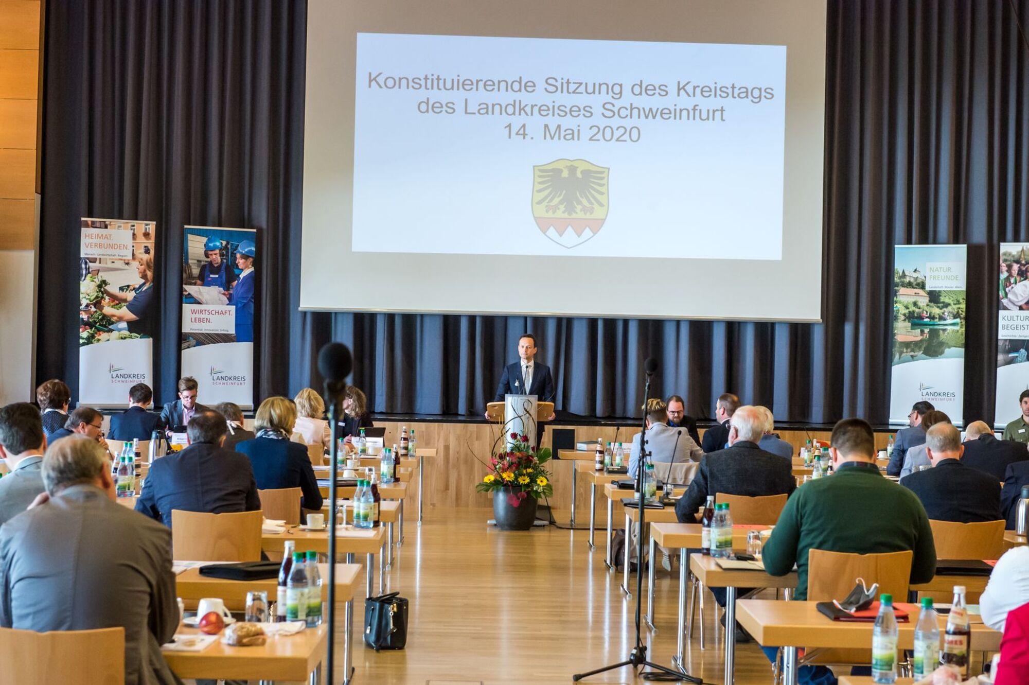 In seiner Eingangsrede ging Landrat Töpper unter anderem auf die Bedeutung der Kommunalpolitik ein. „In jedem Fall bringt die Kommunalpolitik durch die unmittelbare und dauernde Nähe zur Bürgerin und zum Bürger Facetten mit sich, die ihr eine enorme Bedeutung für die Akzeptanz unseres demokratischen Gemeinwesens insgesamt verleihen, eine Akzeptanz, für die zu arbeiten, hart zu arbeiten, uns unser Amtseid, verpflichtet.“ Gleichzeitig betonte der Landrat: „Diese Arbeit aber (…) ist eine schöne Arbeit. Denn es ist eine Arbeit für die Menschen unserer Heimat, eine Arbeit für die gegenwärtigen und die kommenden Generationen, eine Arbeit in Verantwortung für unser kulturelles Erbe, aber eben eine Arbeit, die in allem an der Zukunftsfähigkeit des Landkreises Schweinfurt als Einheit, als Verbund seiner 29 Gemeinden ausgerichtet sein muss.“