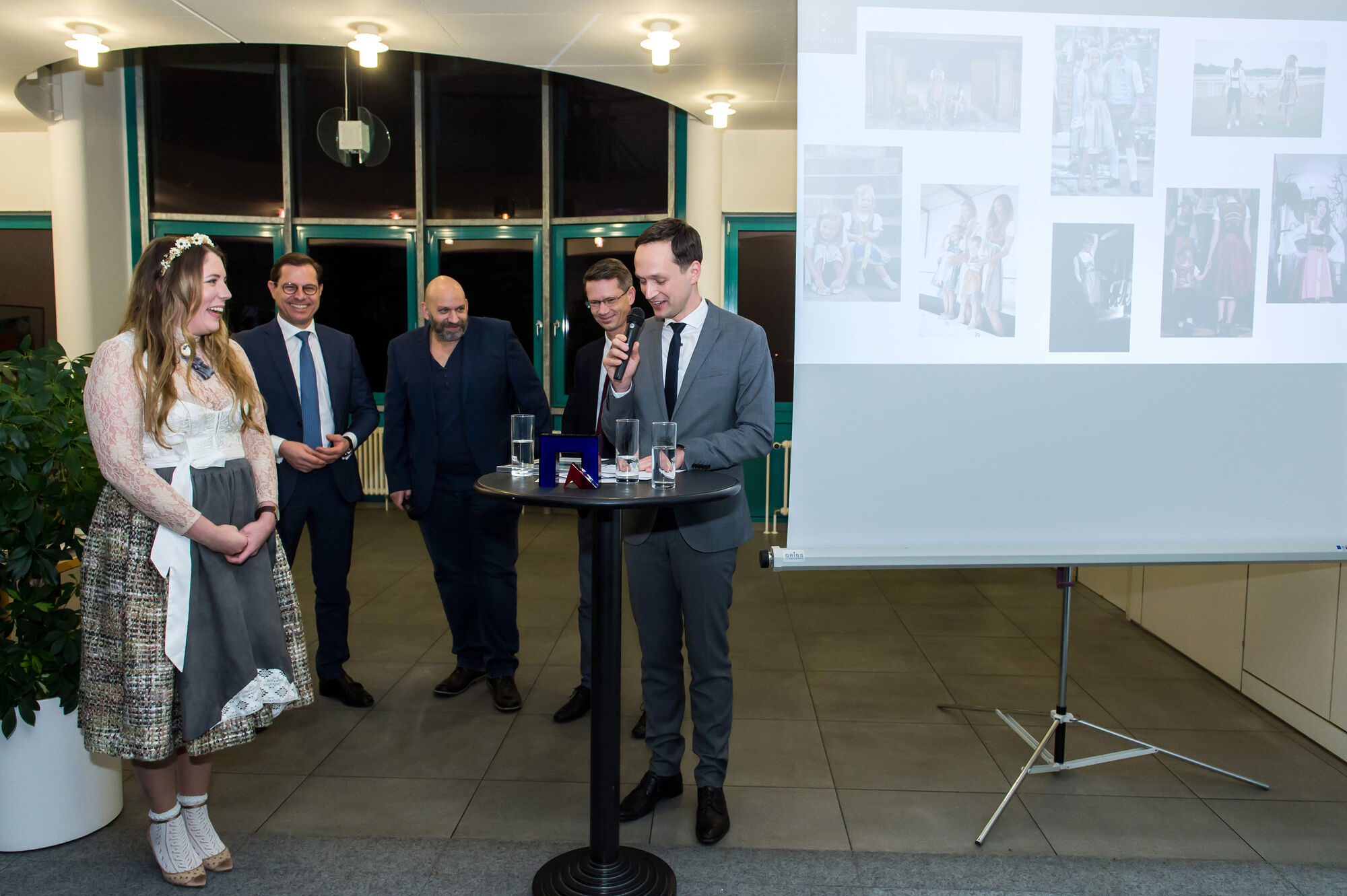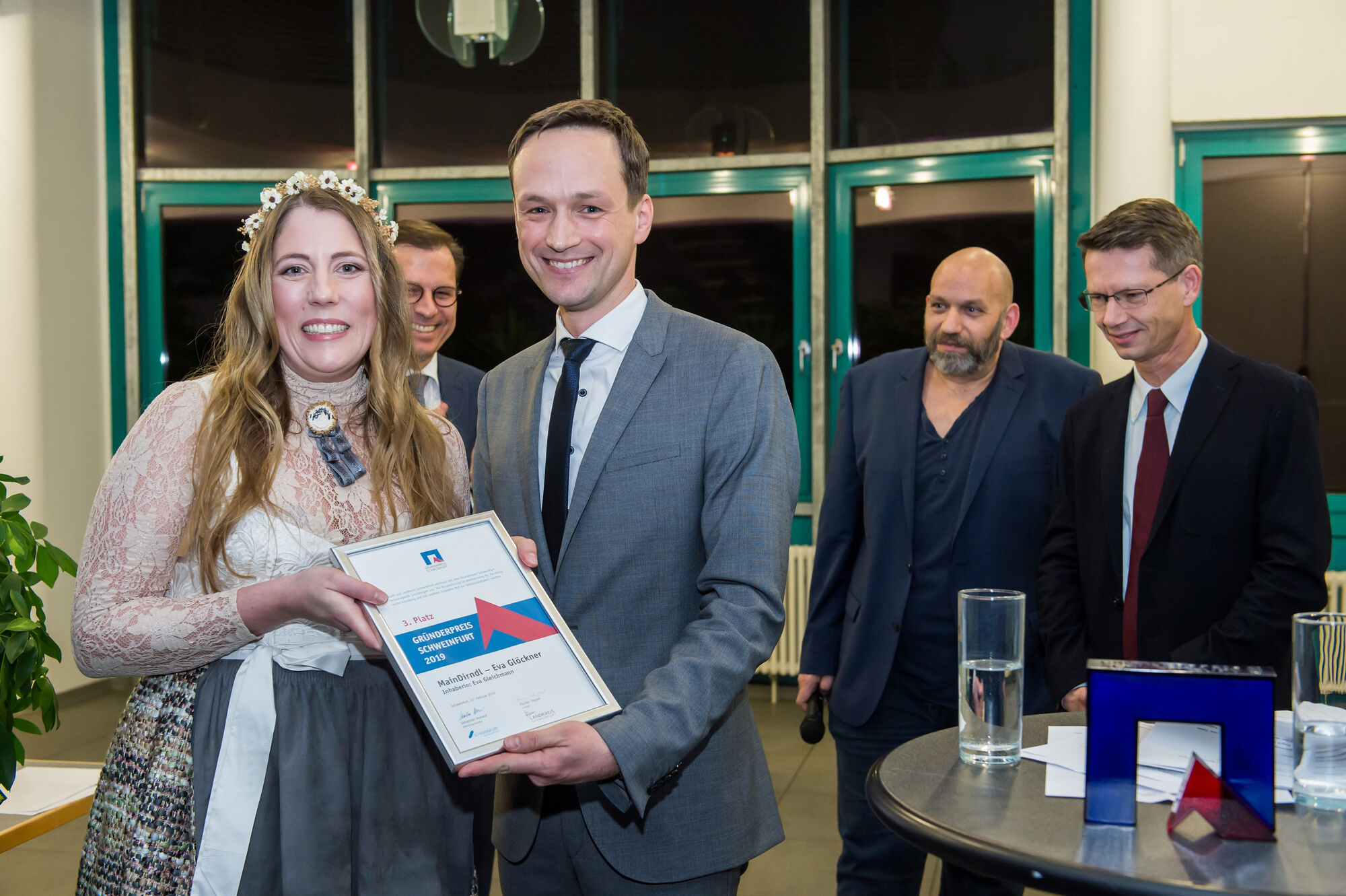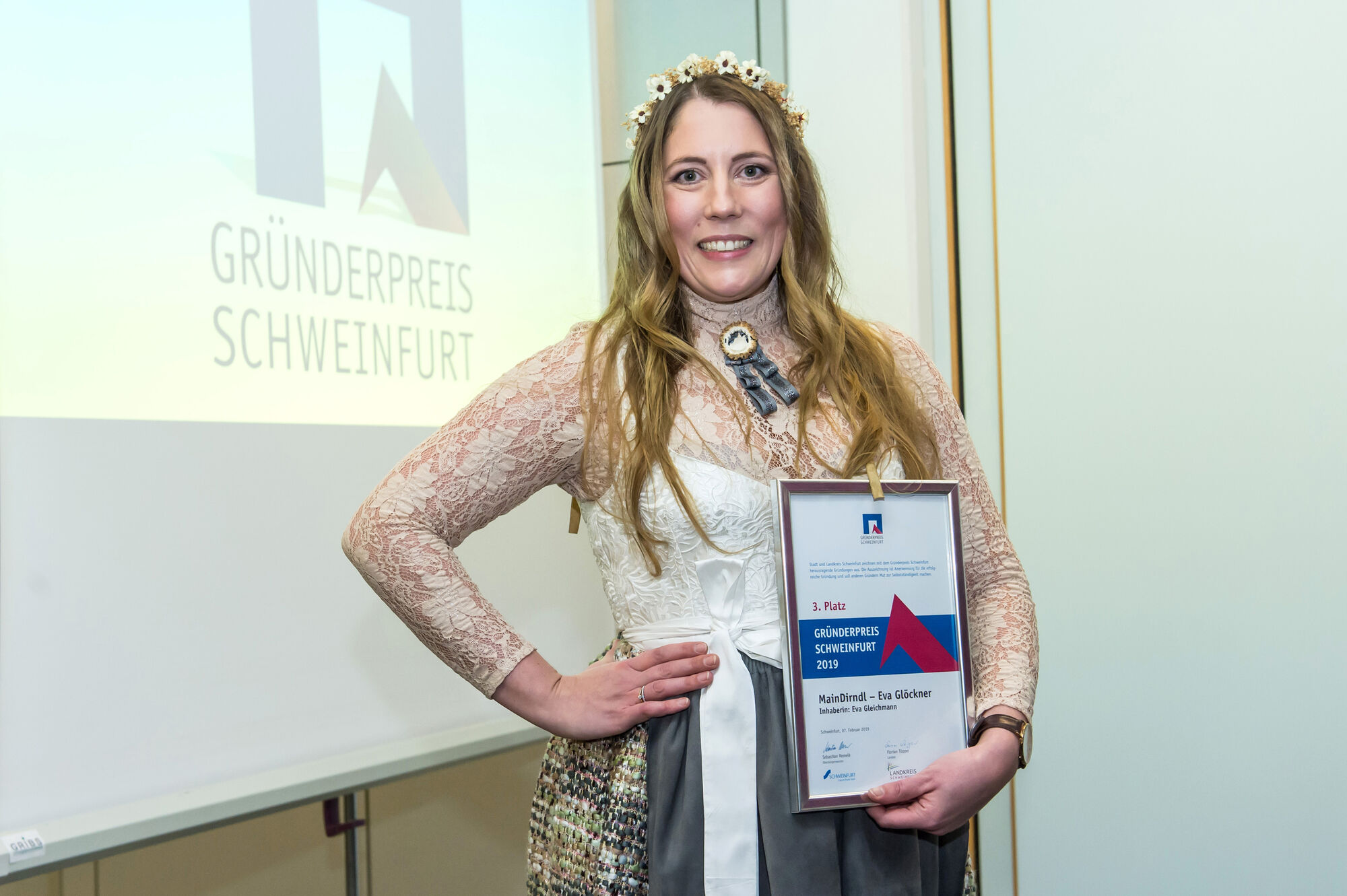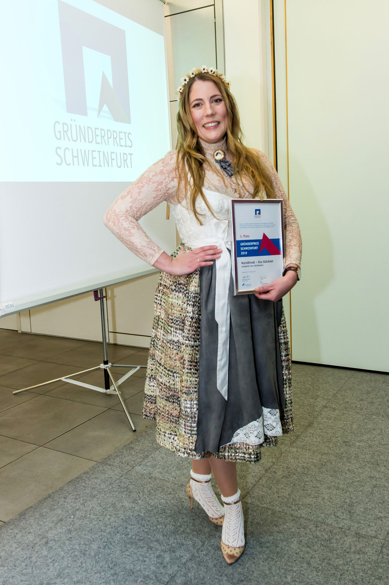 Der dritte Platz des Gründerpreises Schweinfurt 2019 und 2.000 Euro Preisgeld gingen an Eva Gleichmann aus Schonungen mit dem Unternehmen „MainDirndl“. Die Unternehmensgründerin fertigt Designertrachten für Damen, Herren und Kinder. Sie vereinigt in ihrer „Trachtencouture aus Mainfranken“ traditionelles Trachtendesign mit individuellen Stilwünschen der Kunden. Alleinstellungsmerkmal sind exklusiv veredelte Lederschürzen.