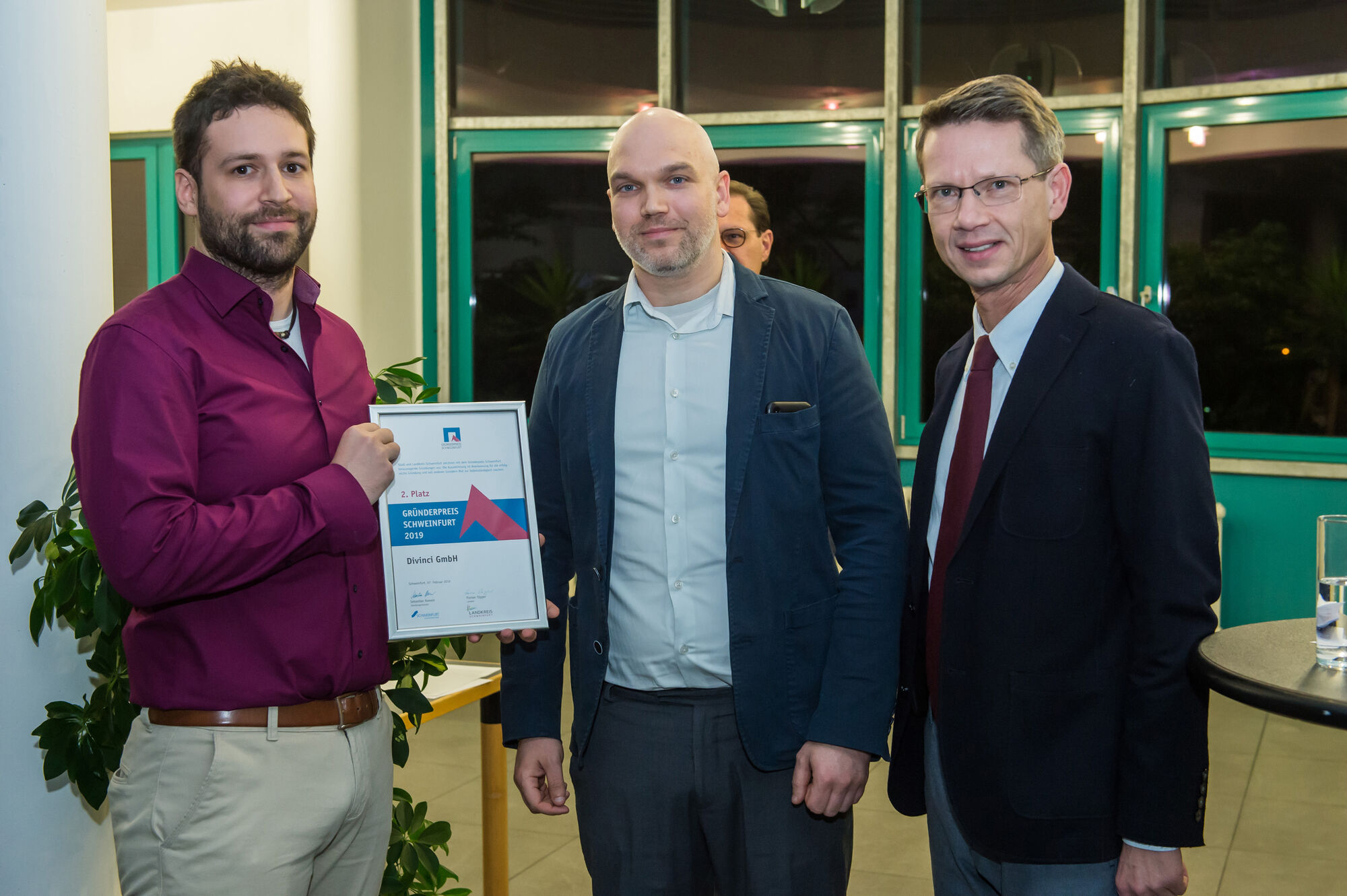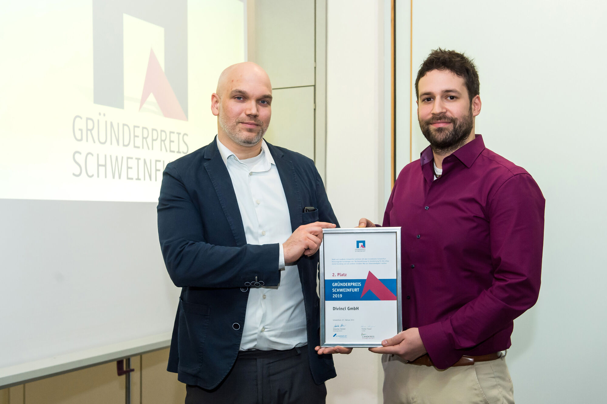 Den zweiten Platz und 3.000 Euro erhielten Jonathan Reichert und Björn Peper für ihre Unternehmensgründung „Divinci GmbH“ in Schweinfurt. Das IT-Unternehmen hat sich spezialisiert auf Design und Programmierung individueller Software, die zu 100 Prozent den Anforderungen der Kunden gerecht wird. Spezielle „mobile Apps“ zählen ebenfalls zu den Wachstumstreibern bei Divinci.