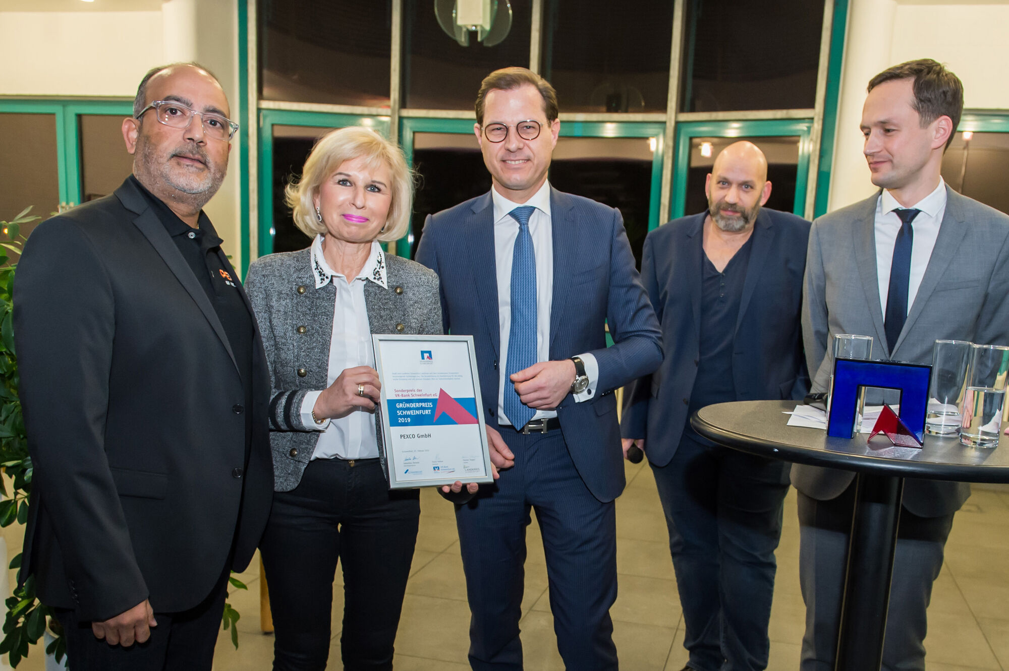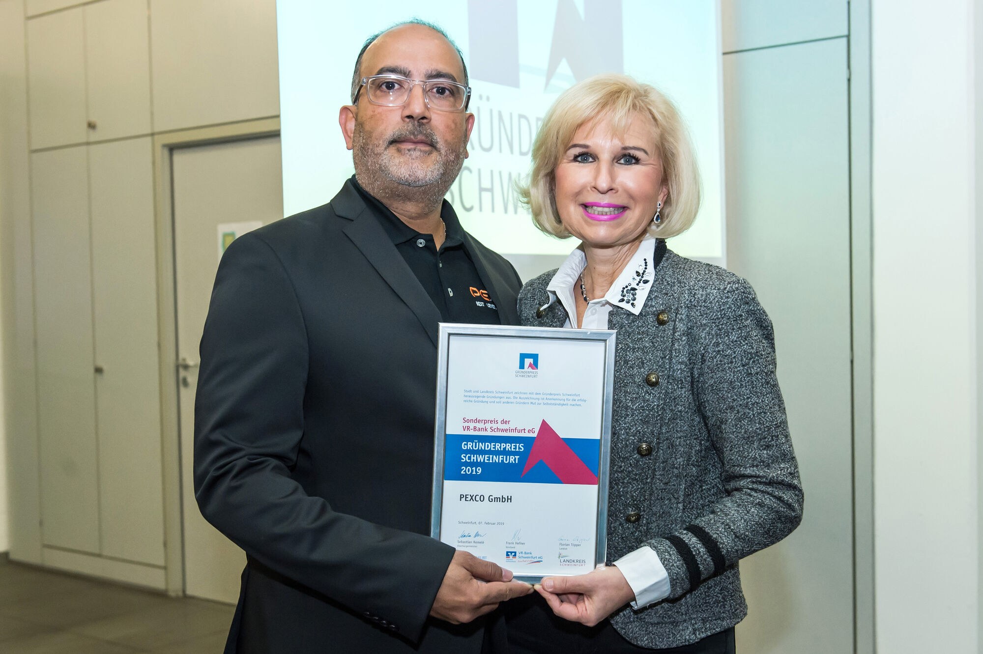Den mit 2.000 Euro dotierten Sonderpreis der VR-Bank Schweinfurt eG überreichte Direktor Frank Hefner an Susanne und Felix Puello aus Schonungen für die Unternehmensgründung „Pexco GmbH“. Das Produktportfolio deckt die ganze Bandbreite in Sachen eBikes und Fahrräder ab. Das Unternehmen zählt bereits 50 Mitarbeiter, die am Hauptsitz Schweinfurt vom Produktdesign bis zum Marketing alle Aufgaben übernehmen.