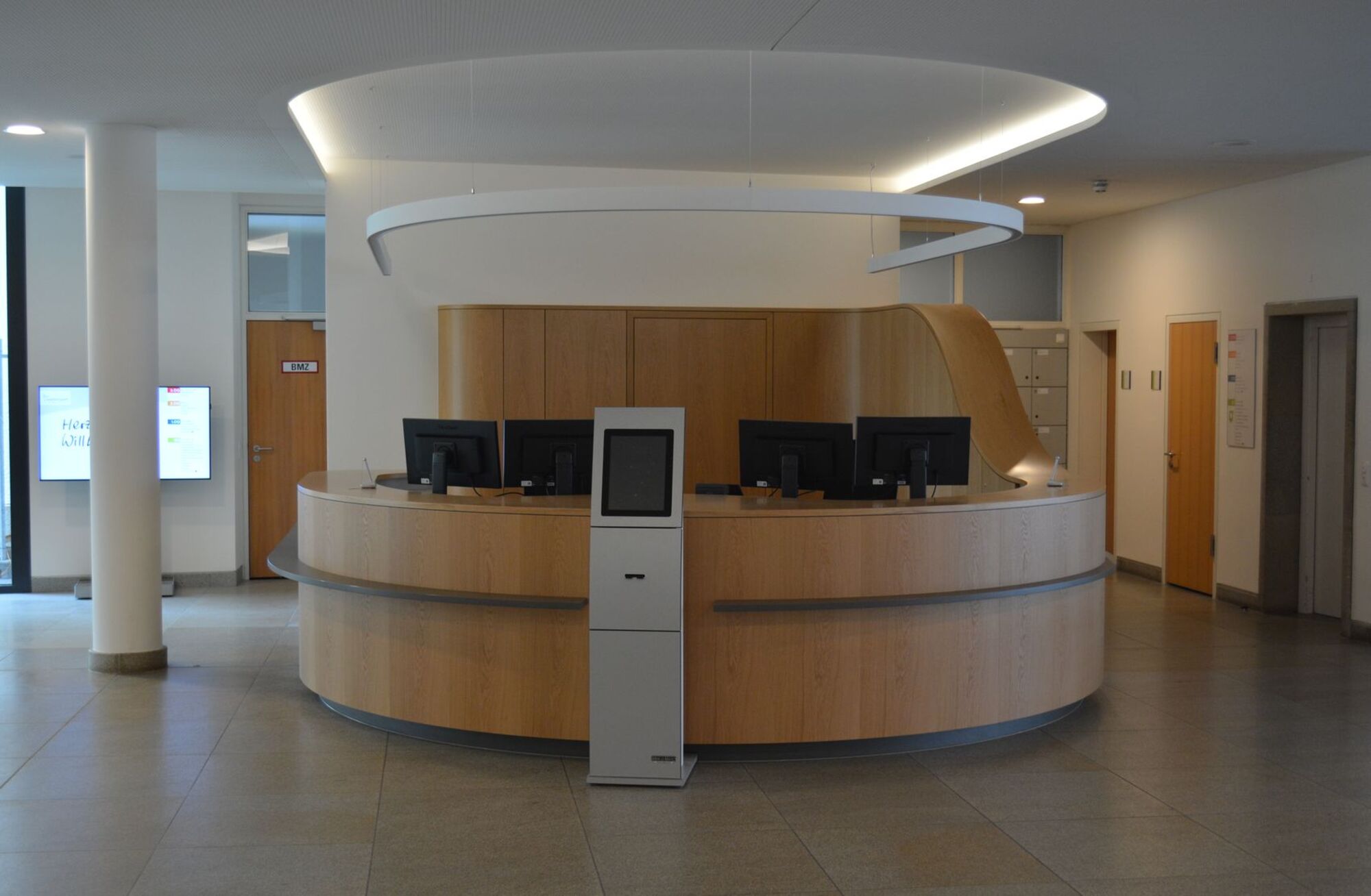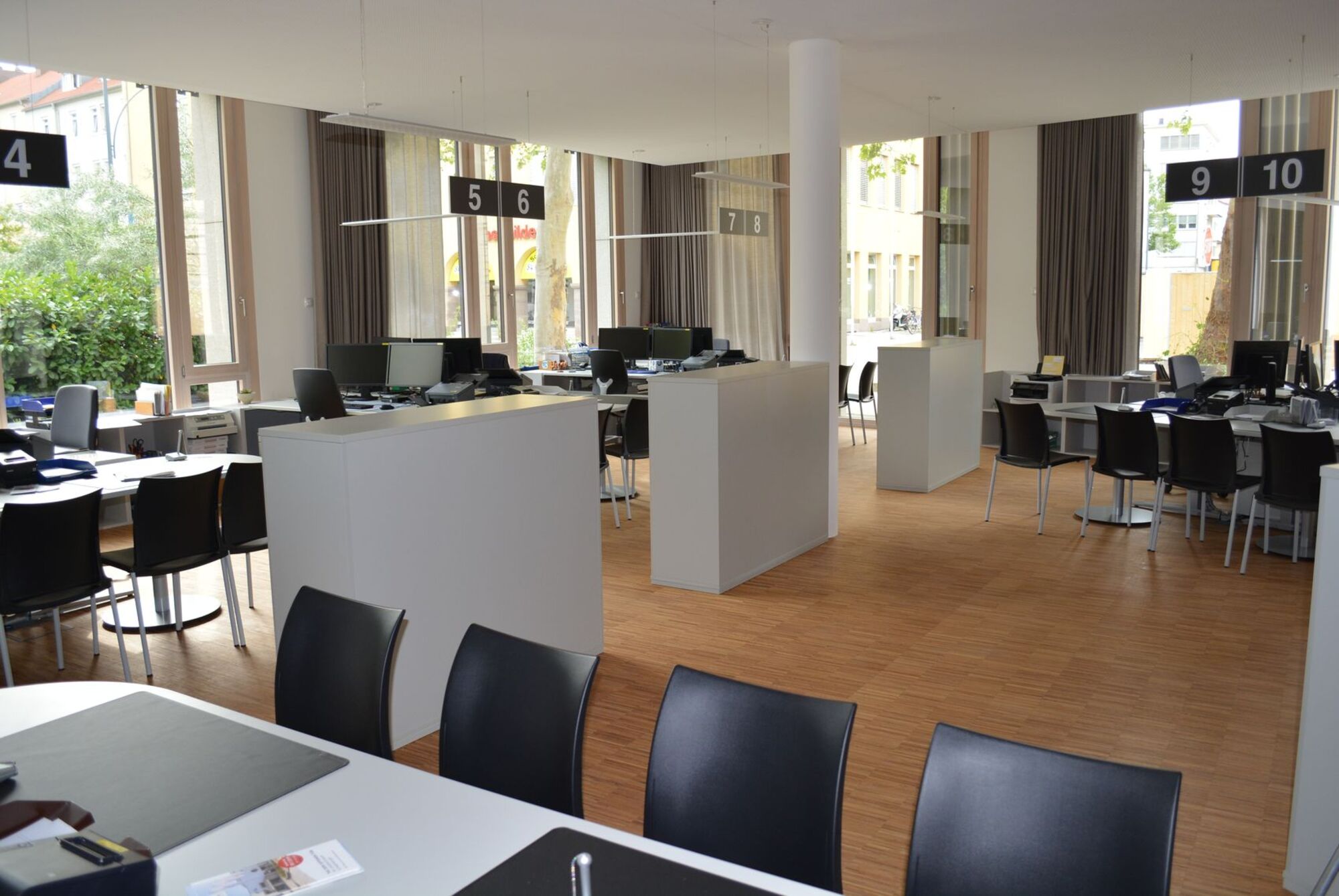 Neben der neu gestalteten Info-Theke gibt es einen zentralen Telefonservice. Die technischen Systeme und das im ganzen Haus modernisierte Leitsystem steuern den Besucherverkehr. Die Zulassungsstelle befindet sich im neuen Großraumbüro neben dem Haupteingang, wo auch die Schilderstelle und der Kassenautomat für kurze Wege verortet sind.