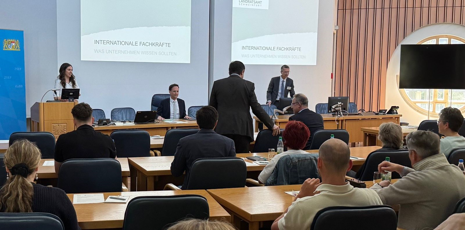 Zahlreiche Unternehmensvertretende aus der Region nutzten am gestrigen Nachmittag die Gelegenheit, sich im Landratsamt Schweinfurt umfassend über die Gewinnung, Anerkennung und Förderung internationaler Fachkräfte zu informieren. Die gemeinsame Veranstaltung „Internationale Fachkräfte – Was Unternehmen wissen sollten“ wurde von der Wirtschaftsförderung des Landkreises Schweinfurt, der Wirtschaftsförderung der Stadt Schweinfurt und der Region Mainfranken GmbH organisiert.