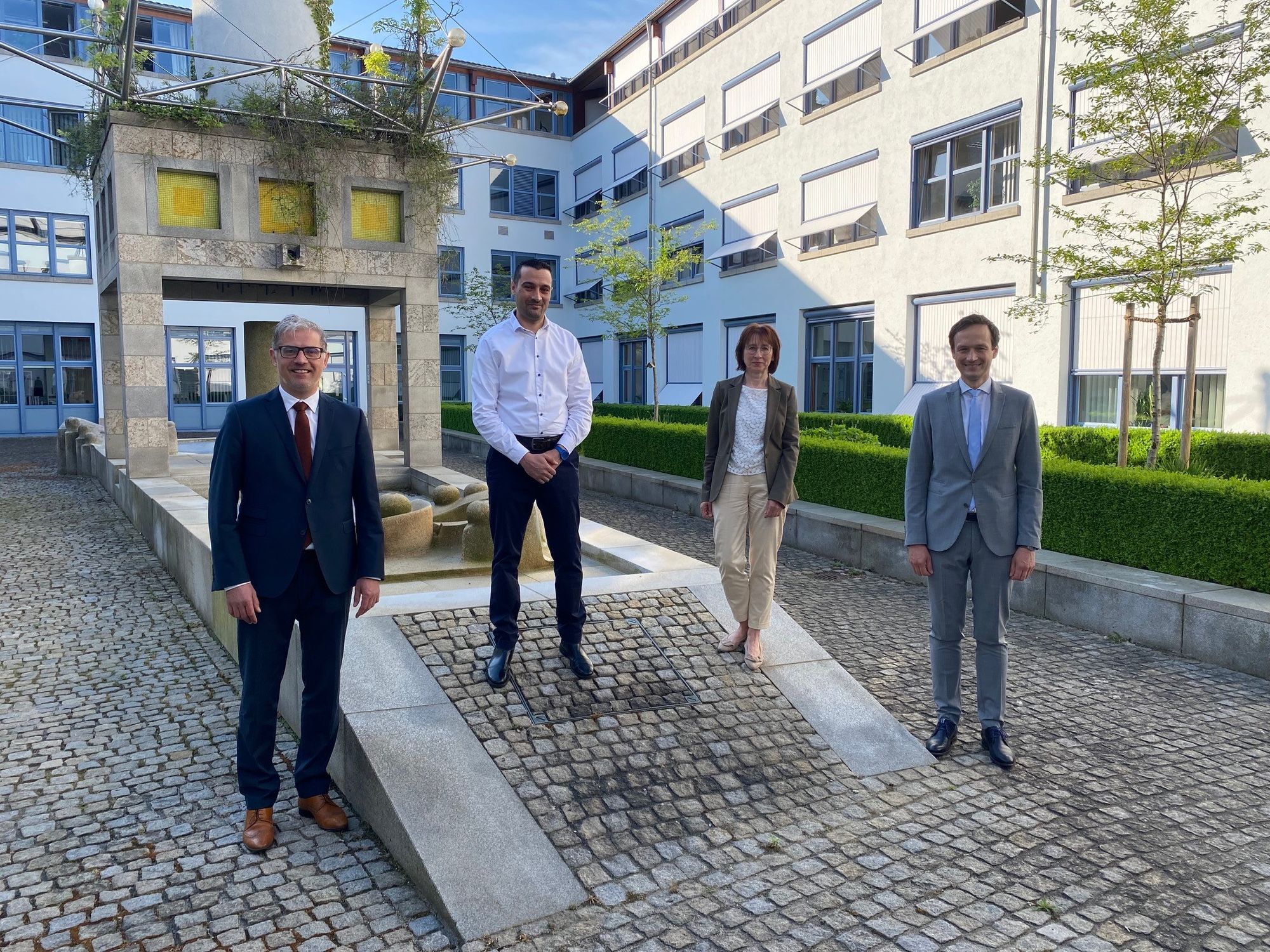 Landkreis Schweinfurt. Landrat Florian Töpper freut sich zusammen mit Personalleiter Marco Röder über die bestandene Abschlussprüfung eines 2015 nach Deutschland geflüchteten Familienvaters aus Syrien, der am Landratsamt Schweinfurt zum Verwaltungsfachangestellten ausgebildet worden ist.