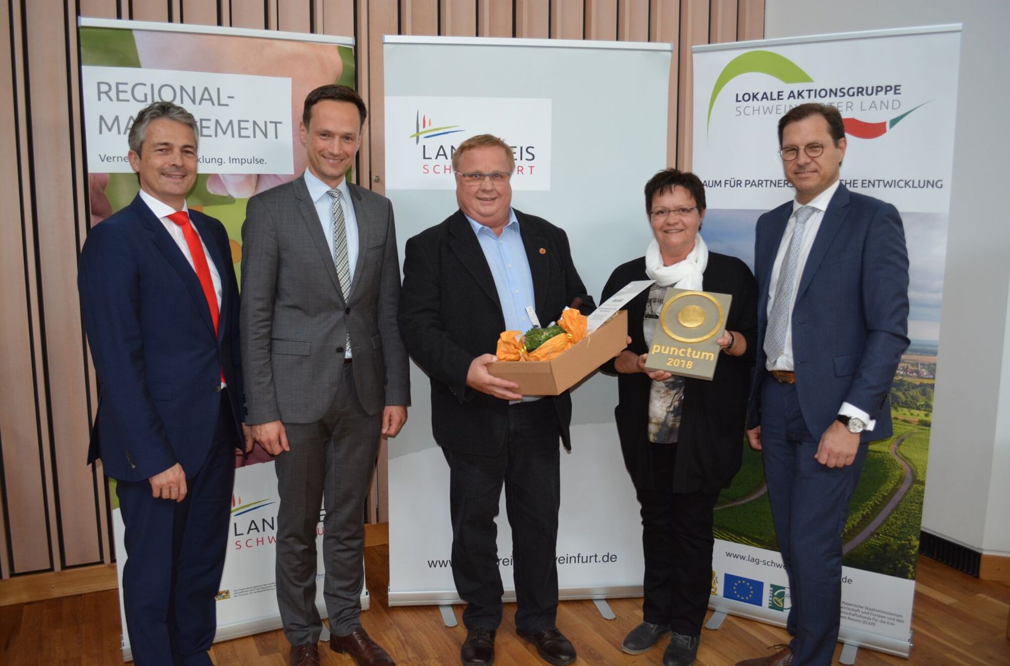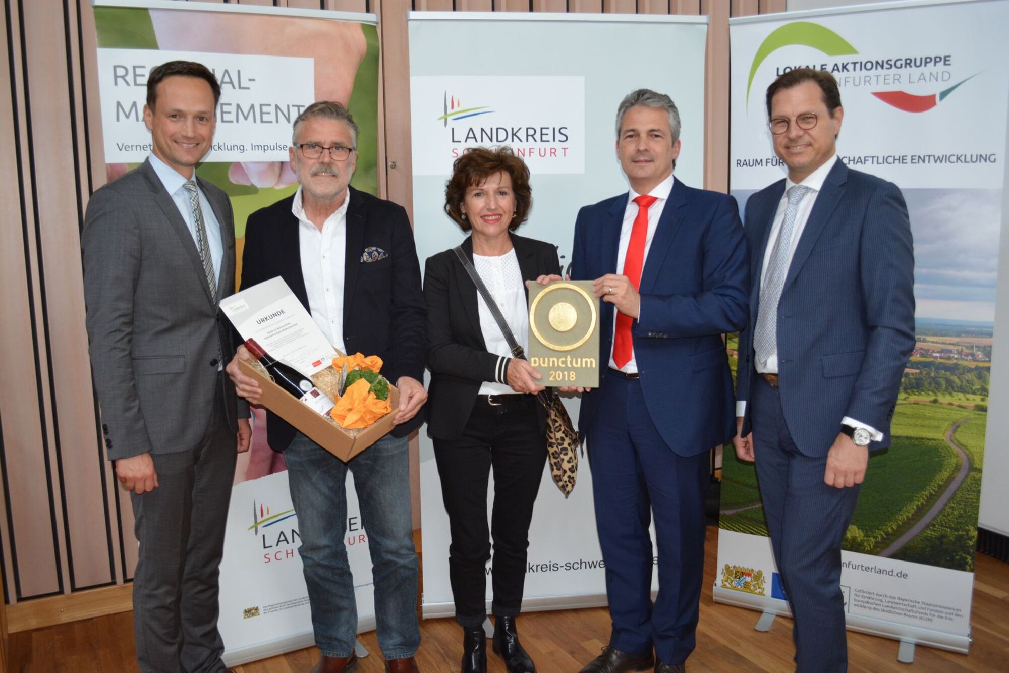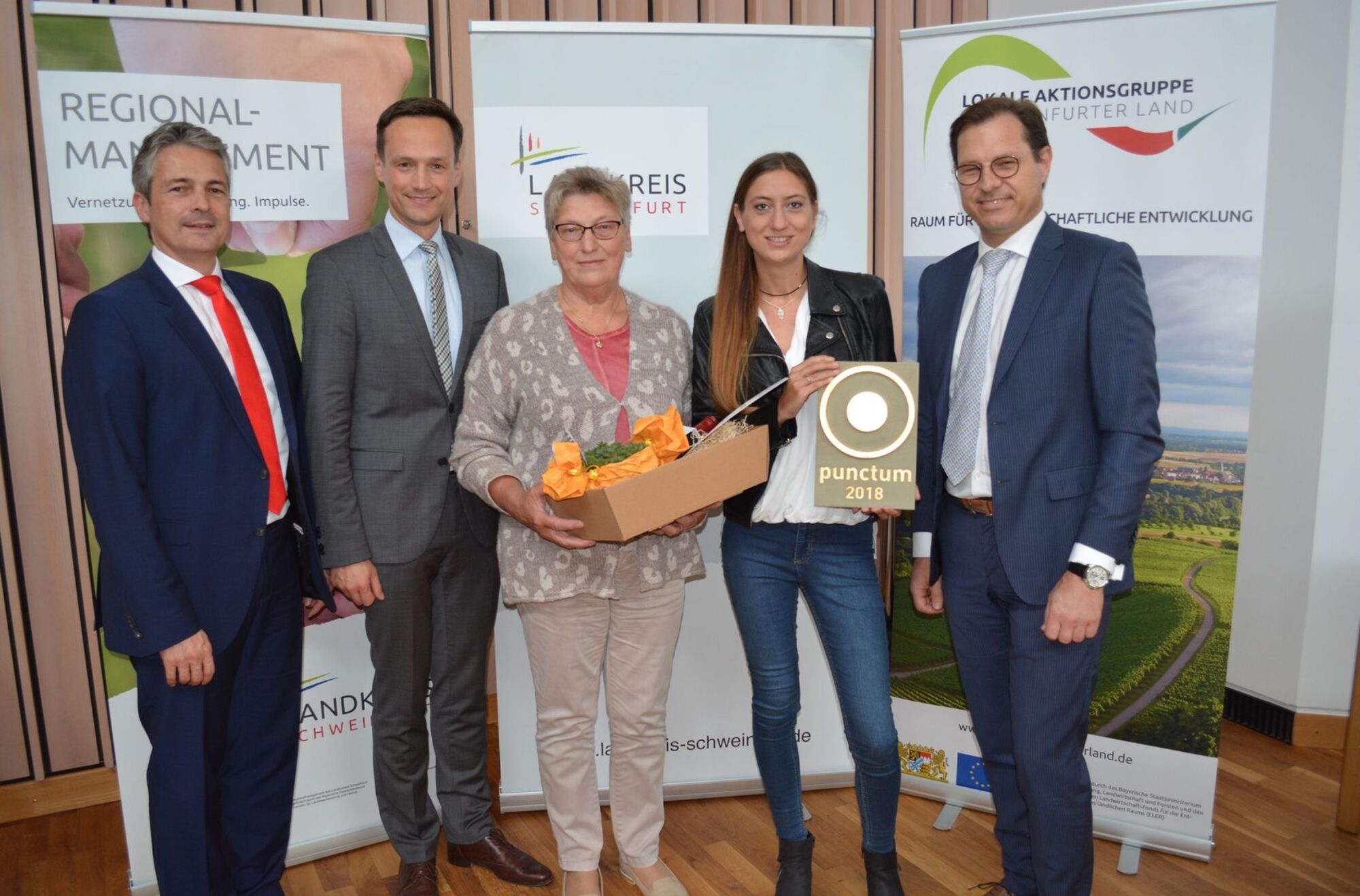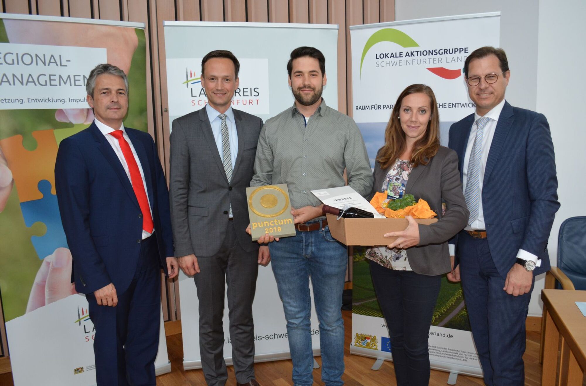 Sie alle freuten sich über das Preisgeld von je 1000 Euro sowie den eigens für diesen Wettbewerb gestalteten Preis punctum des Künstlers und Architekten Matthias Braun. Sowohl die Sparkasse Schweinfurt-Hassberge als auch die VR-Bank Schweinfurt unterstützten den Landkreis bei dem Preisgeld des Gestaltungspreises mit je 1000 Euro.