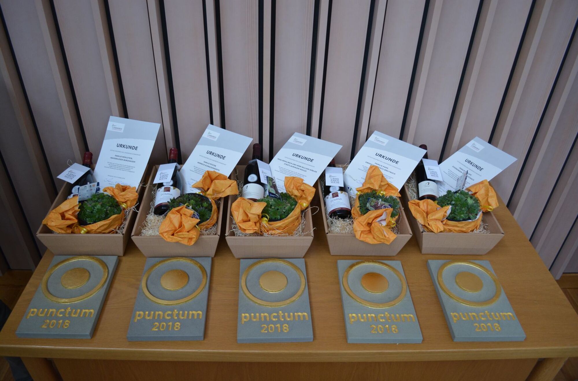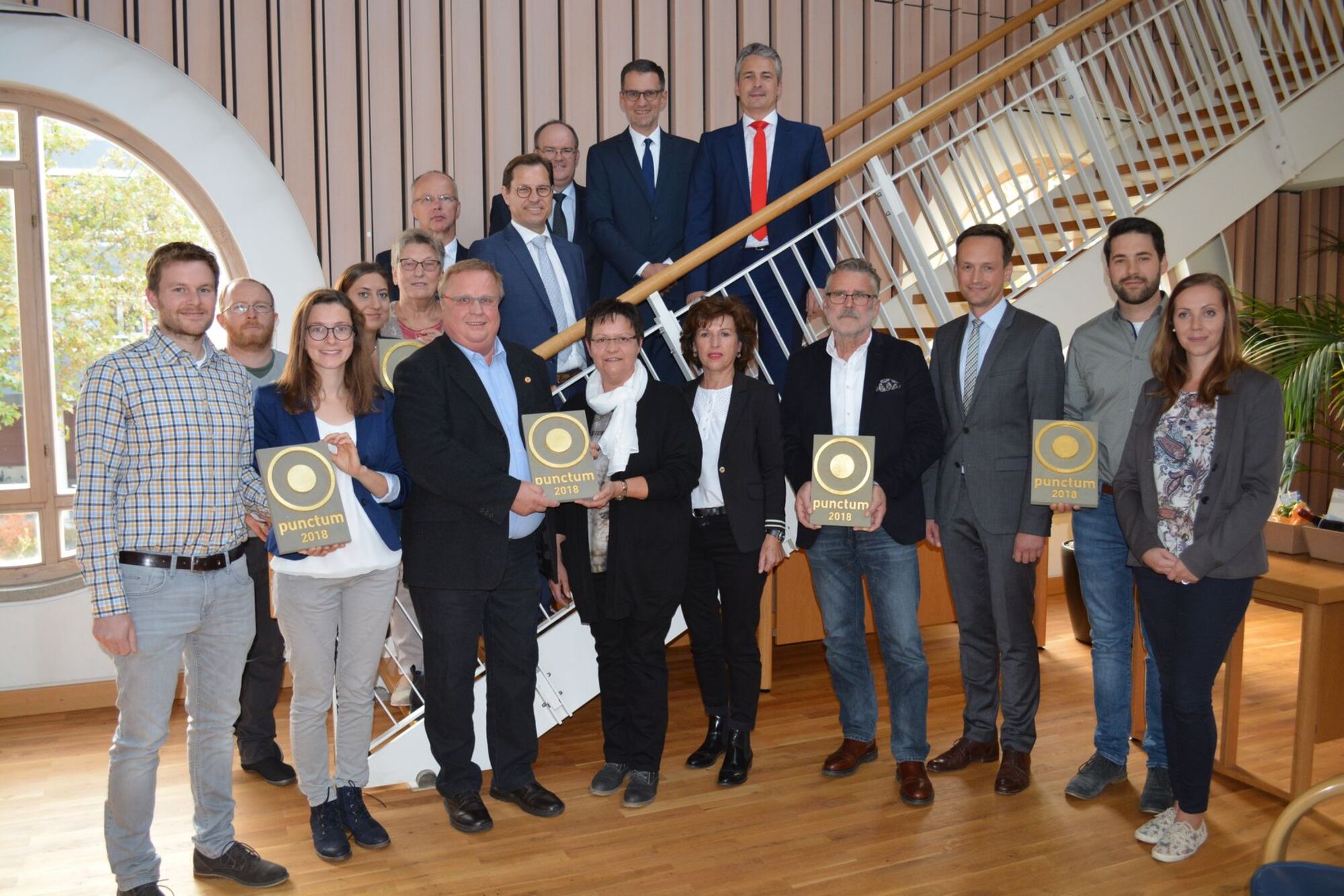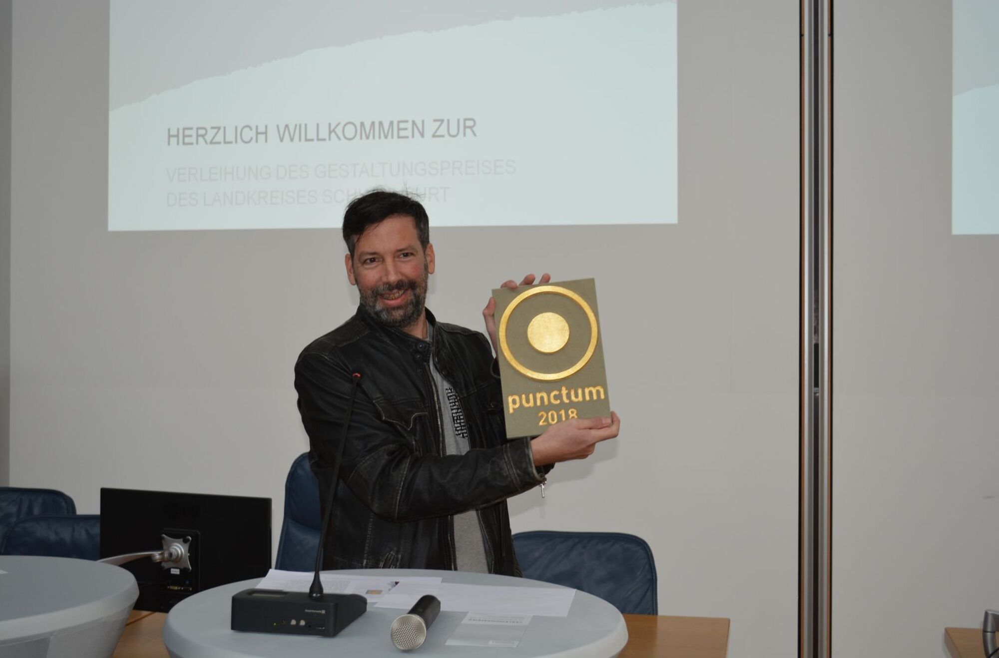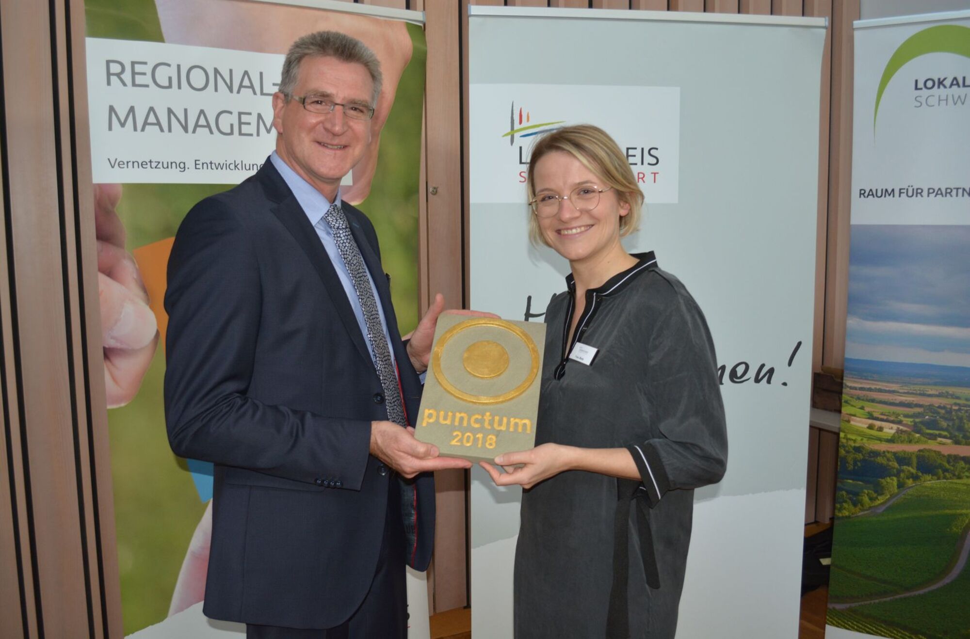 Sie alle freuten sich über das Preisgeld von je 1000 Euro sowie den eigens für diesen Wettbewerb gestalteten Preis punctum des Künstlers und Architekten Matthias Braun. Sowohl die Sparkasse Schweinfurt-Hassberge als auch die VR-Bank Schweinfurt unterstützten den Landkreis bei dem Preisgeld des Gestaltungspreises mit je 1000 Euro.
