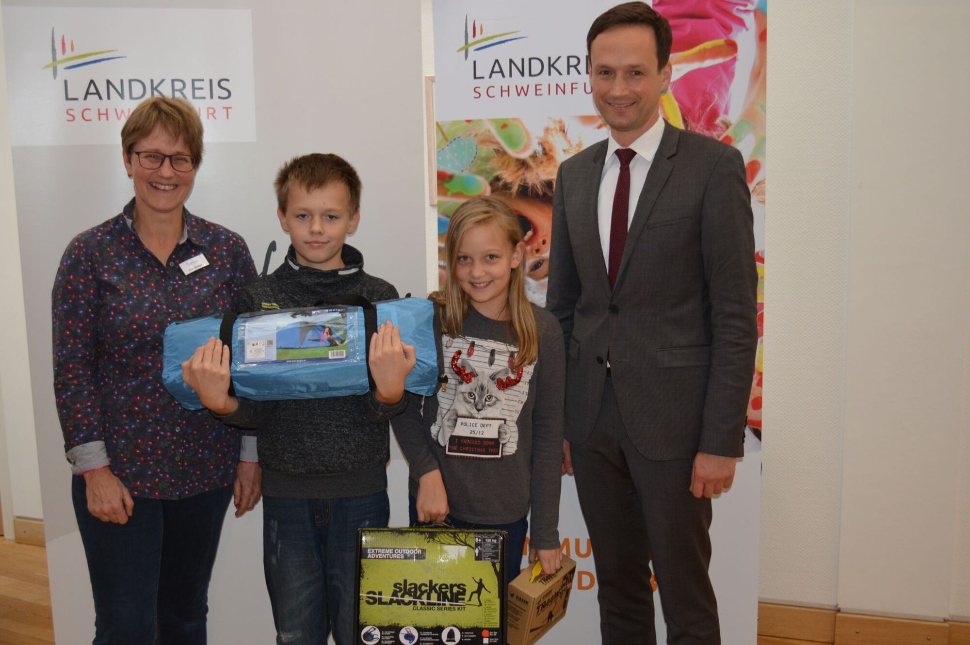 Landkreis Schweinfurt. Bei der diesjährigen ufra war am Stand des Landkreises Schweinfurt auch die Kommunale Jugendarbeit (Koja) des Landkreises vertreten. Neben vielen Informationen rund um die Arbeit und vielen Freizeitangebote der Koja für Kinder- und Jugendliche konnten die jüngeren Besucher am Stand auch an einem Quiz teilnehmen, bei dem attraktive Preise zu gewinnen waren. Den ersten Preis, ein Drei-Personen-Kuppelzelt sicherte sich Jastin Röder aus Oberlauringen, den zweiten Platz belegte Lena Hubert aus Marktsteinach. Sie durfte sich über ein Slackline Set freuen. Die Preise überreichten Landrat Florian Töpper und Kreisjugendpflegerin Bettina Stampf. Die Drittplatzierte, eine junge Frau aus Werneck, konnte an der Preisvergabe leider nicht teilnehmen. Sie erhalt einen Beachvolleyball.