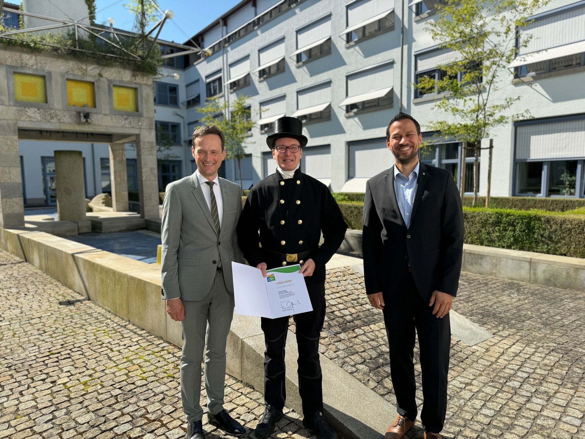 Landkreis Schweinfurt. Im Beisein des ersten Bürgermeisters des Marktes Werneck, Sebastian Hauck, hat Schweinfurts Landrat Florian Töpper dem Zeuzlebener Kaminkehrermeister Bernhard Rath die Urkunde „Umwelt- und Klimapakt Bayern“ im Landratsamt ausgehändigt. Die Auszeichnung überreichte der Landrat im Namen des bayerischen Staatsministers für Umwelt und Verbraucherschutz, Thorsten Glauber.