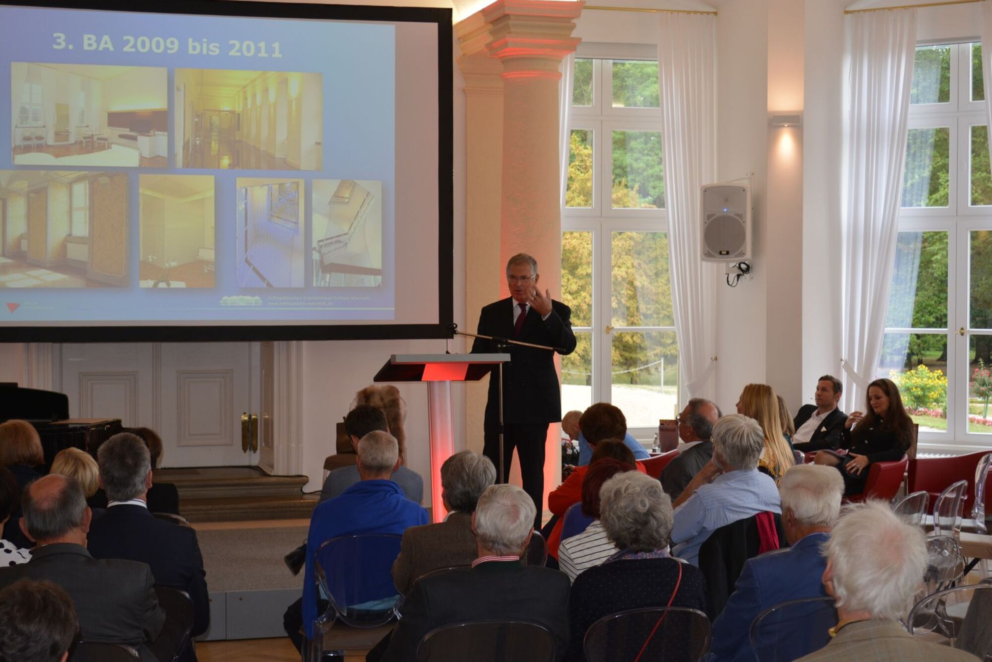 Im Café Balthasar stellte der Ärztliche Direktor der Orthopädischen Klinik, Prof. Dr. Christian Hendrich, anschließend fundiert und unterhaltsam die Entwicklung des Schlosses Werneck dar. Durch Investitionen in Patientenzimmer, Operationssäle und Technik wurde in den vergangenen 20 Jahren nicht nur eine gelungene Verbindung der historischen Bausubstanz und moderner Elemente geschaffen. Die Orthopädische Klinik im Schloss Werneck gehört auch dadurch mittlerweile zu den bedeutendsten orthopädischen Kliniken in Deutschland. Dies zeigt sich nicht nur bei verschiedenen Rankings von Kliniken, den Fallzahlen oder der Patientenzufriedenheit. Auch Spitzensportler kommen regelmäßig nach Werneck, um hier ihre Verletzungen behandeln zu lassen.