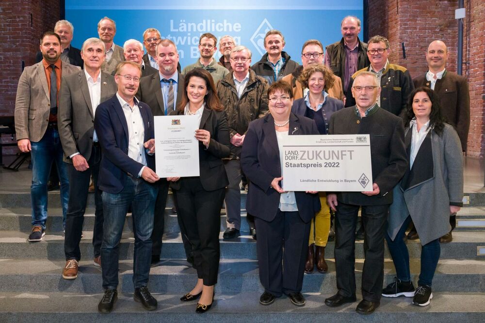 Im Bild: Üchtelhausen gewinnt den Staatspreis 2022 in der Kategorie „Herausragende Leistungen im Bereich Klimaschutz und Anpassung an den Klimawandel“. Das Bild wurde bei der Preisverleihung mit Staatsministerin Michaela Kaniber (vorne, Zweite von links) in München aufgenommen. Für den Landkreis Schweinfurt überbrachte stellvertretender Landrat Thomas Vizl (zweite Reihe links) die Glückwünsche.