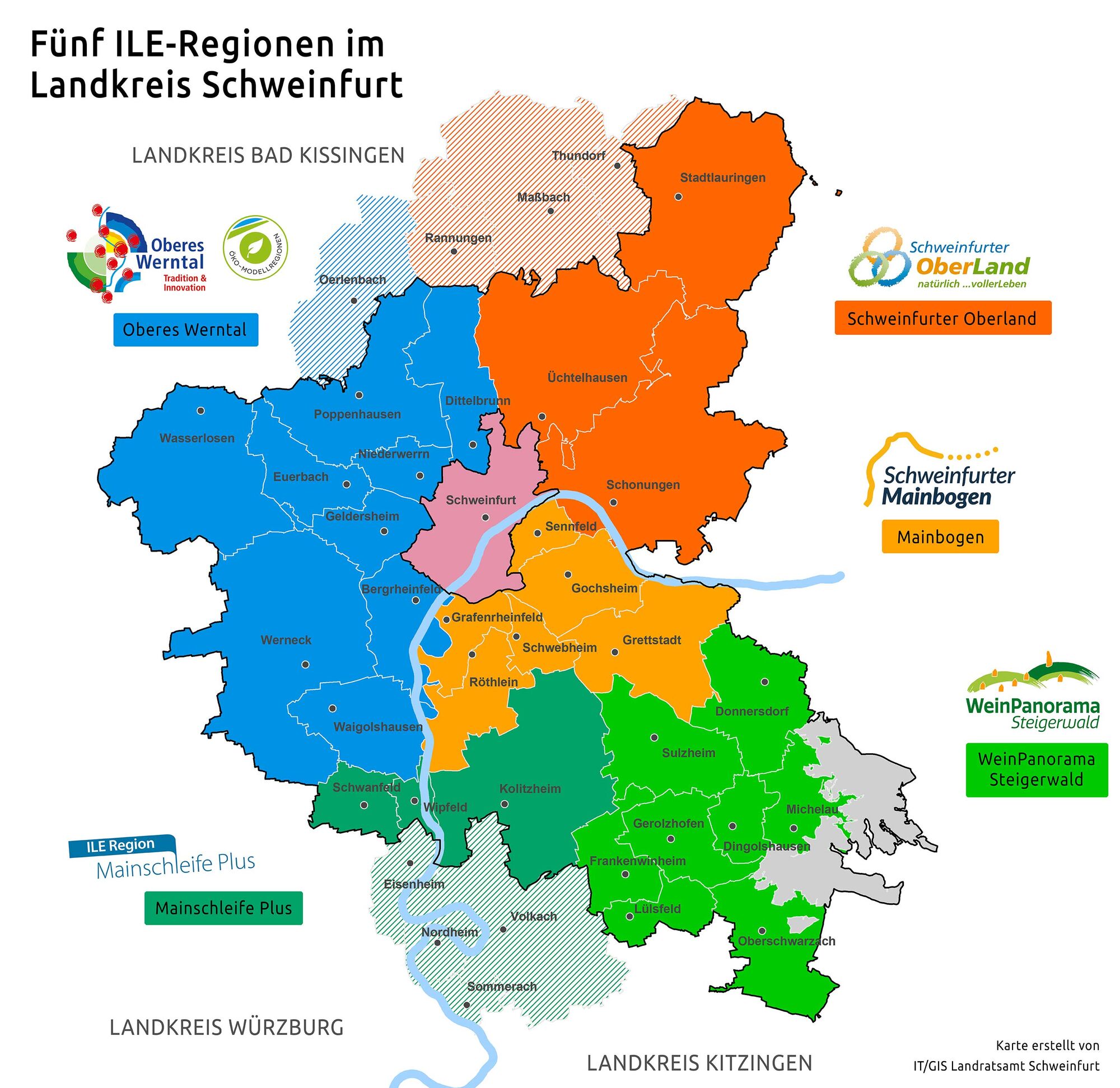 Folgende fünf ILE-Regionen (ILE= Integrierte Ländliche Entwicklung) gliedern den Landkreis Schweinfurt.