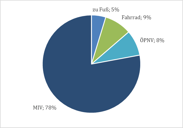 Die Verteilung des Transportaufkommens in der Verkehrsstatistik (also die Verkehrsmittelwahl) wird als Modal Split bezeichnet. Hier ergibt sich im Landkreis Schweinfurt ein eindeutiges Bild. Der Anteil der mit dem motorisierten Individualverkehr (MIV) zurückgelegten Wege liegt hier bei 78 %. Der ÖPNV wird bei 8 % der Wege genutzt, das Fahrrad bei 9 %, Fußwege machen schließlich 5 % aus (siehe Abbildung 1), den Vergleich zum bundesweiten Durschnitt zeigt Abbildung 2. Erkennbar hier ist die noch stärkere Dominanz des motorisierten Individualverkehrs im Landkreis Schweinfurt (+78%) sowie der sehr geringe Anteil an Fußwegen (5%). Trotz der Dominanz des MIV liegt der Anteil des ÖPNV mit 8% etwas über dem Durchschnitt für ländliche Räume.