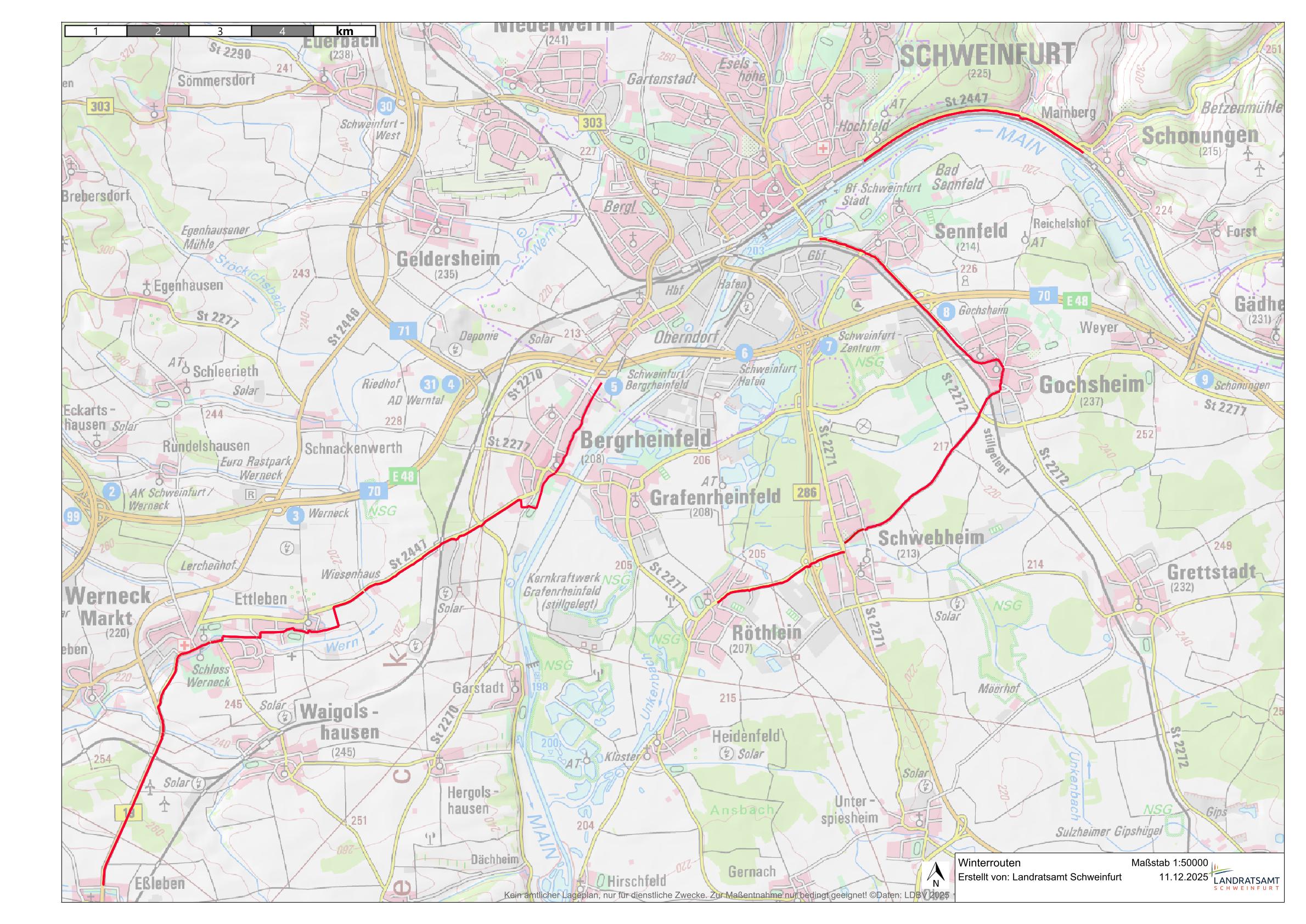 Darstellung befahrbarer Winterrouten im Landkreis Schweinfurt